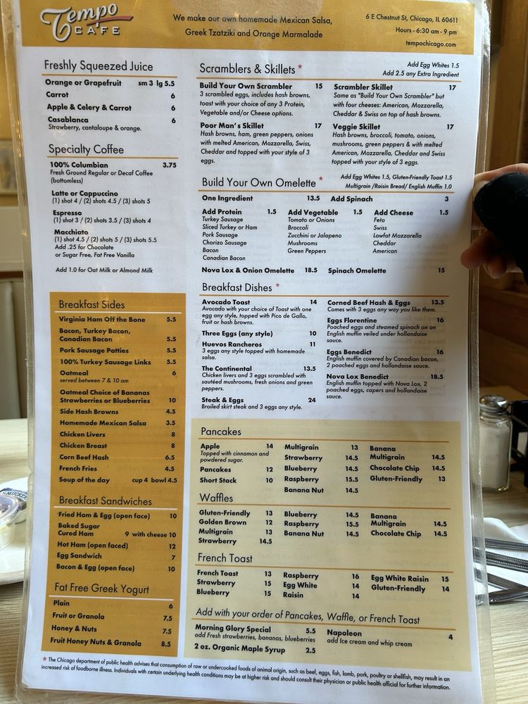 Tempo Cafe, located in Chicago, is a must-visit spot for breakfast and brunch lovers. The menu offers a variety of delicious options including 3 Eggs Any Style, Avocado Toast, Eggs Benedict, and Veggie Skillet. With vegan options, wheelchair accessibility, and a range of amenities such as TV, free Wi-Fi, and gender-neutral restrooms, Tempo Cafe ensures a comfortable dining experience for all customers. The restaurant also provides delivery, takeout, and catering services. The warm and inviting atmosphere, along with the attentive waiter service, makes it a great choice for groups, families, and even those looking to work or enjoy happy hour specials. If you're in the mood for a hearty and satisfying meal, Tempo Cafe is the place to be.
